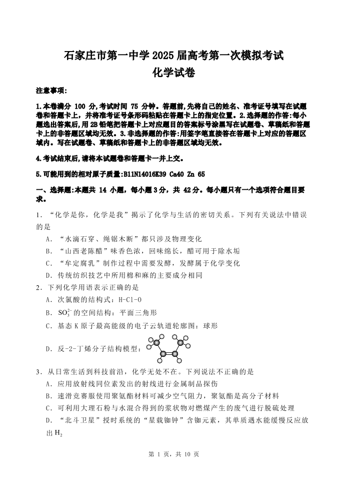 石家庄市第一中学2025届高考第一次模拟考试 化学.pdf