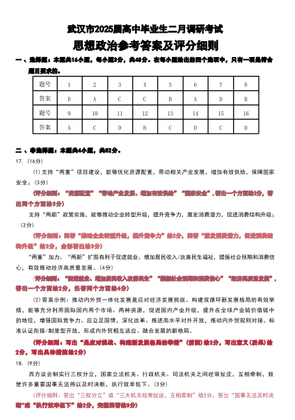 武汉市2025届高中毕业生二月调研考试 政治答案.pdf