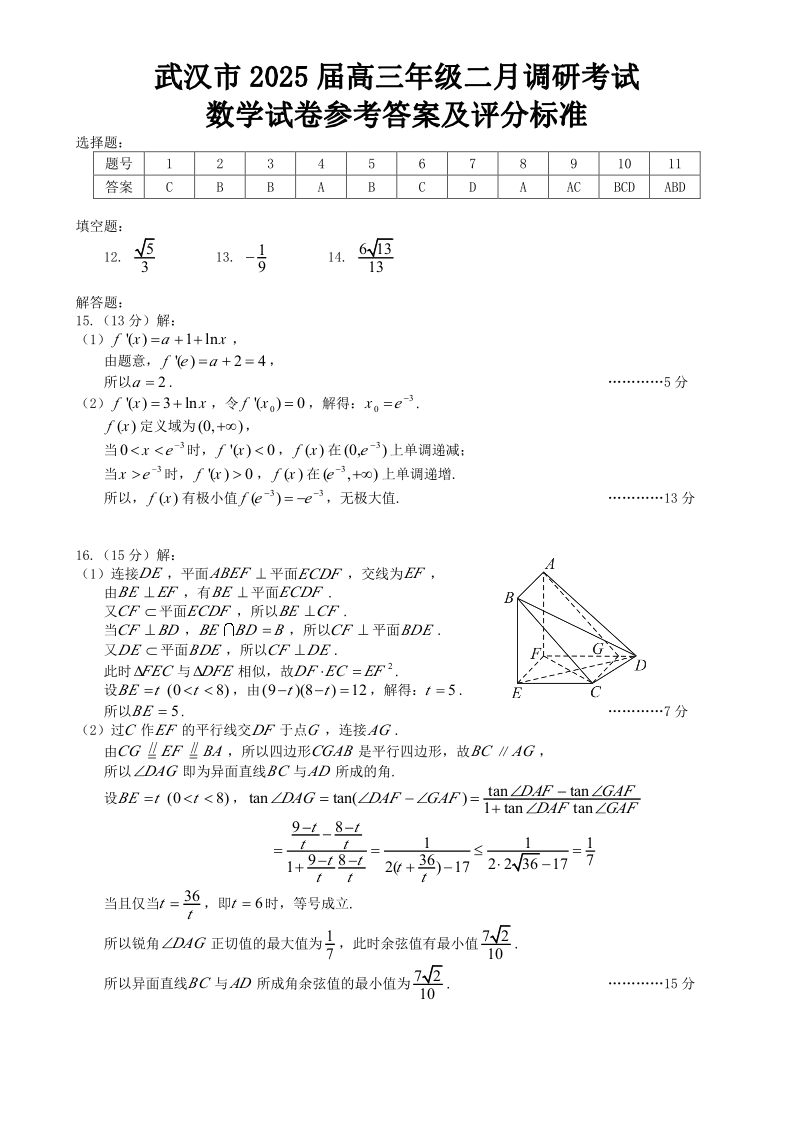 武汉市2025届高中毕业生二月调研考试 数学答案.pdf