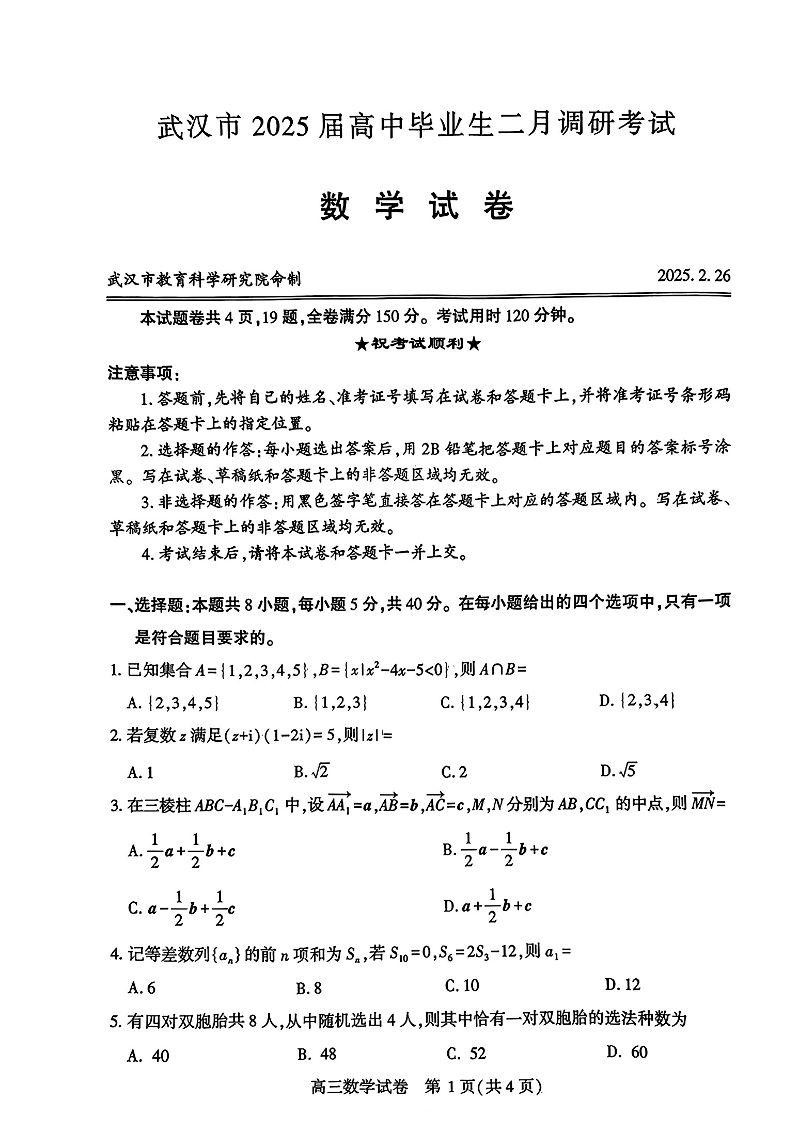 武汉市2025届高中毕业生二月调研考试 数学.pdf