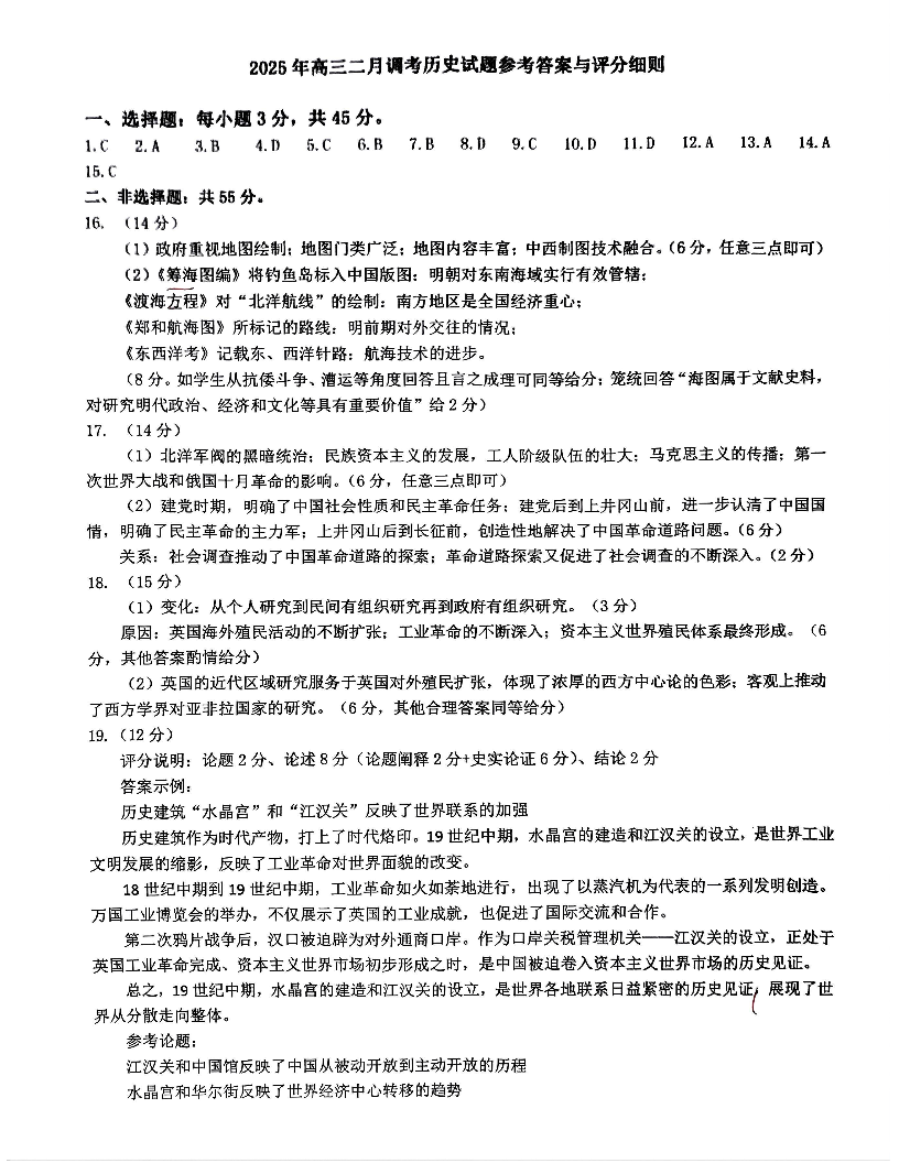 武汉市2025届高中毕业生二月调研考试 历史答案.pdf