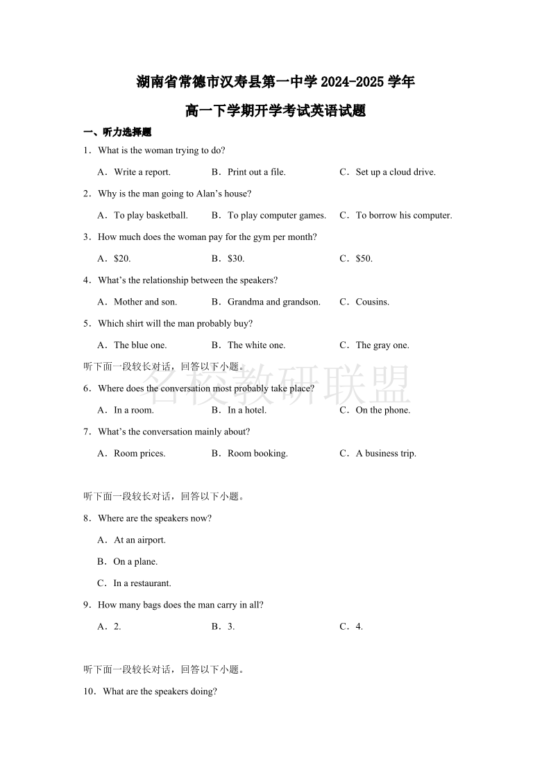 湖南省常德市汉寿县第一中学2024-2025学年高一下学期开学考试 英语(含答案).pdf
