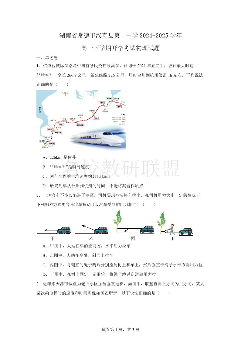 湖南省常德市汉寿县第一中学2024-2025学年高一下学期开学考试 物理(含答案).pdf