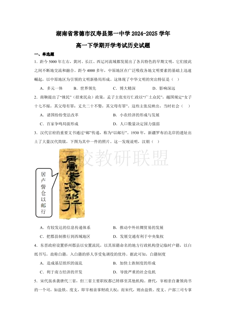 湖南省常德市汉寿县第一中学2024-2025学年高一下学期开学考试 历史(含答案).pdf