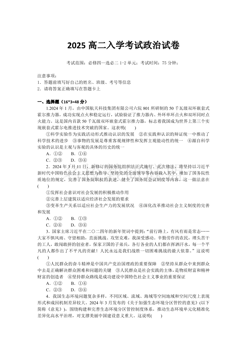 湖南省邵阳县二中2025年上学期政治入学考试试卷.pdf
