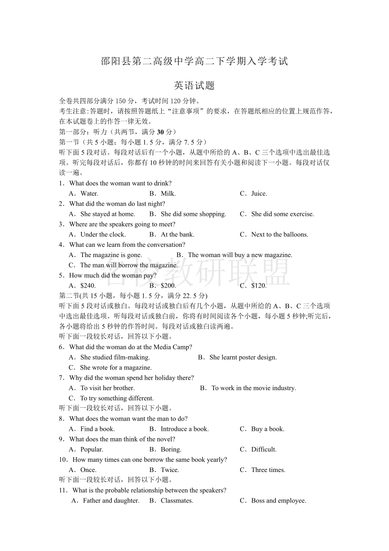 湖南省邵阳县二中2025年上学期英语入学考试试卷.pdf