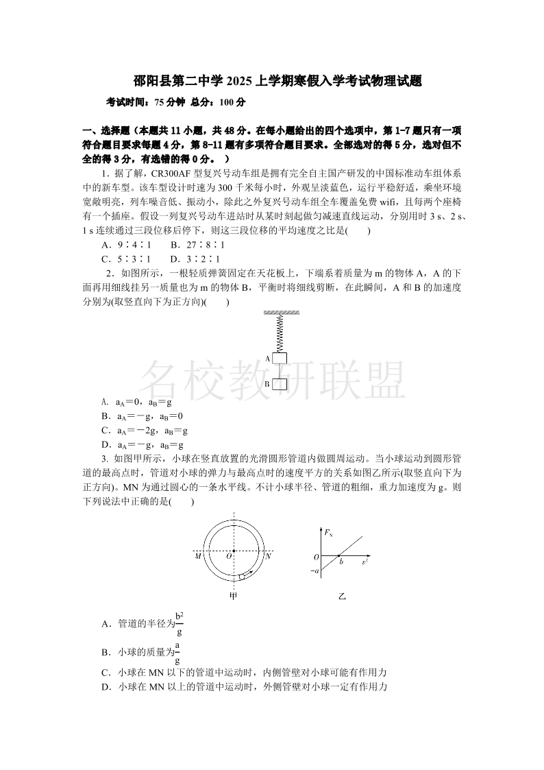 湖南省邵阳县二中2025年上学期物理入学考试试卷.pdf