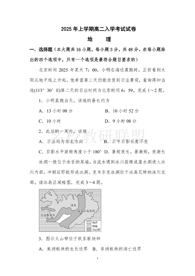 湖南省邵阳县二中2025年上学期地理入学考试试卷.pdf