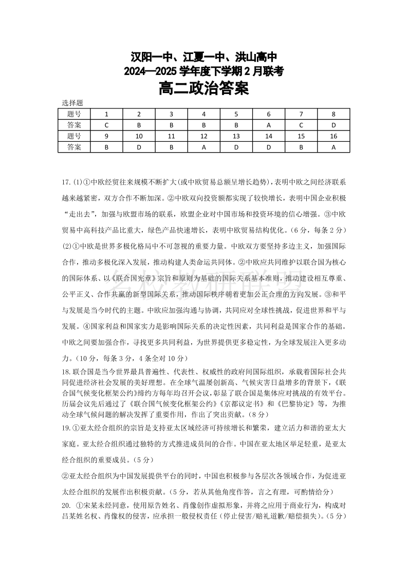汉阳一中、江夏一中、洪山高中 高二政治答案.pdf