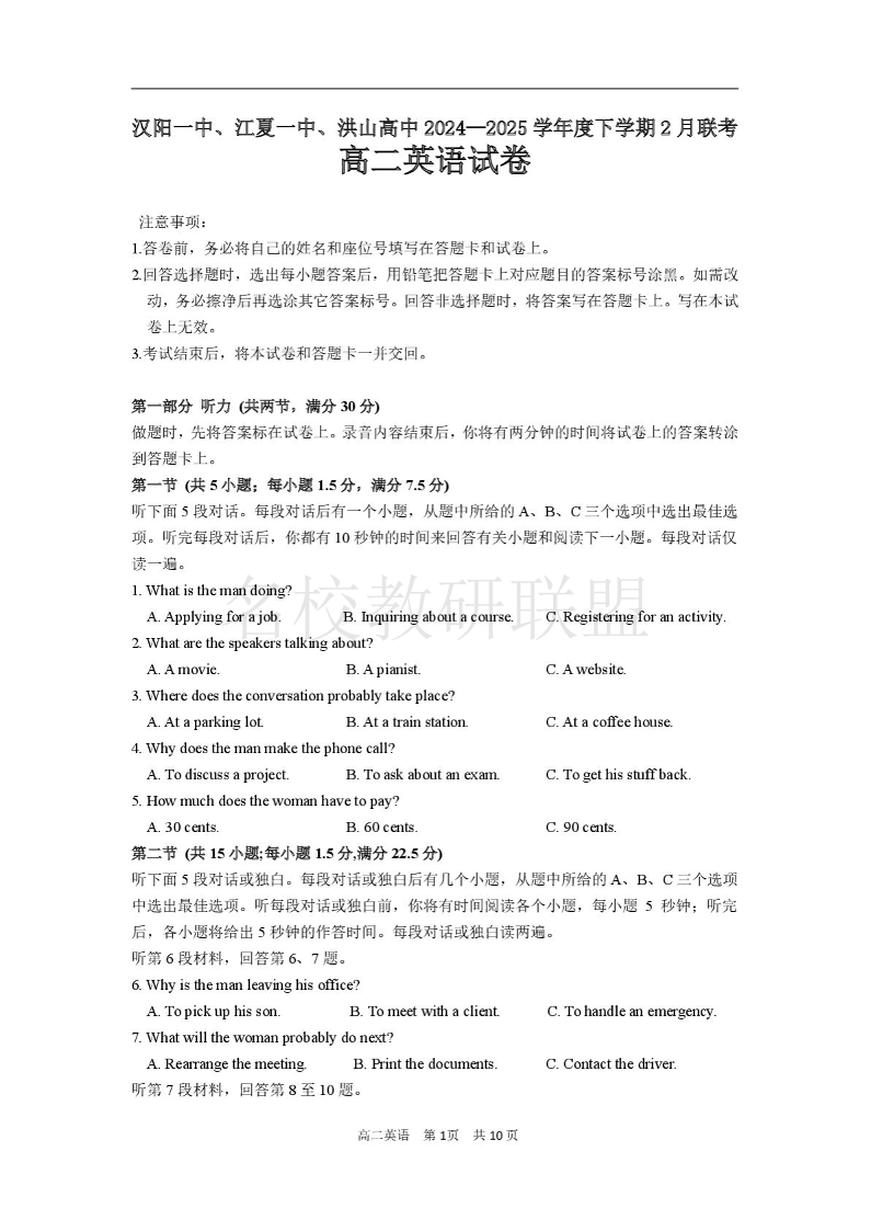 汉阳一中、江夏一中、洪山高中 高二英语.pdf