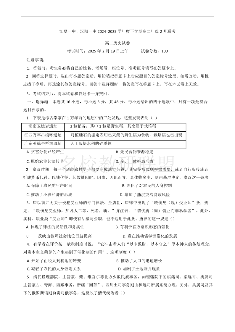 汉阳一中、江夏一中、洪山高中 高二历史(含答案).pdf