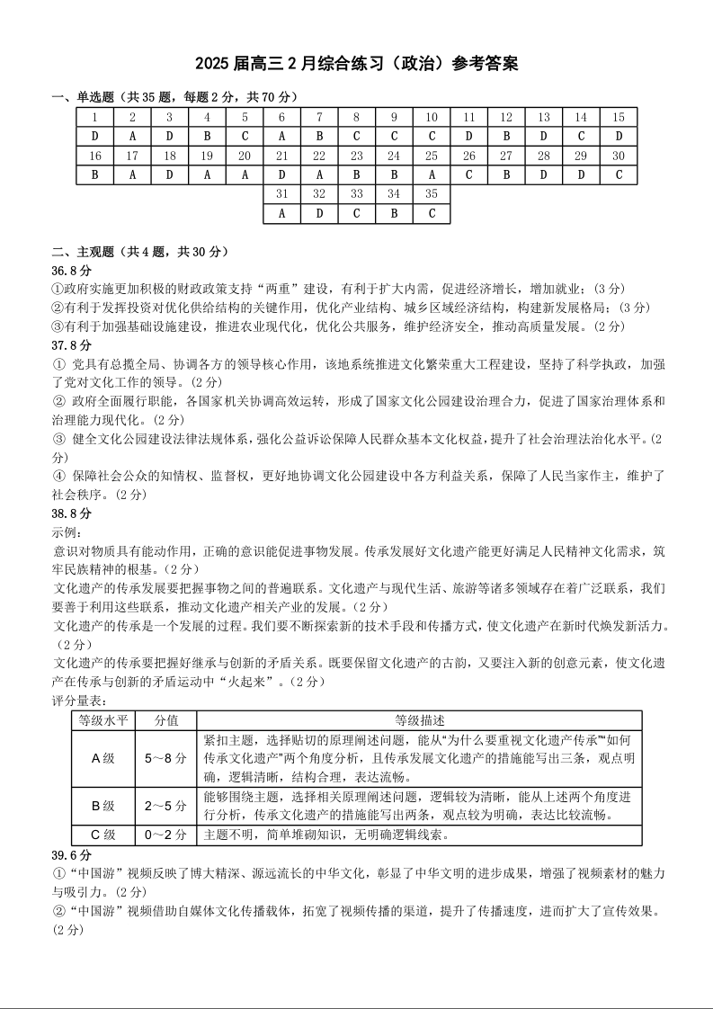 江苏省锡山高级中学2024-2025学年高三下学期2月综合练习 政治答案.docx