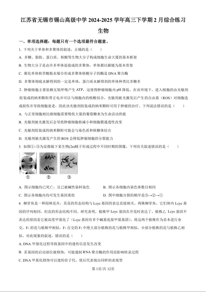 江苏省锡山高级中学2024-2025学年高三下学期2月综合练习 生物.docx