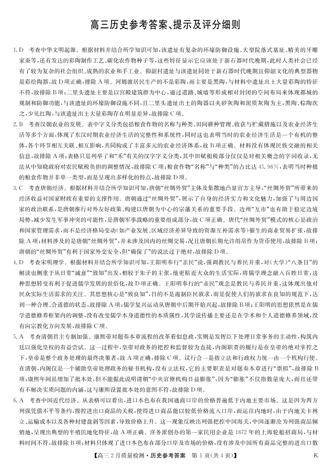 九师联盟2025届高三2月质量检测 历史答案.pdf