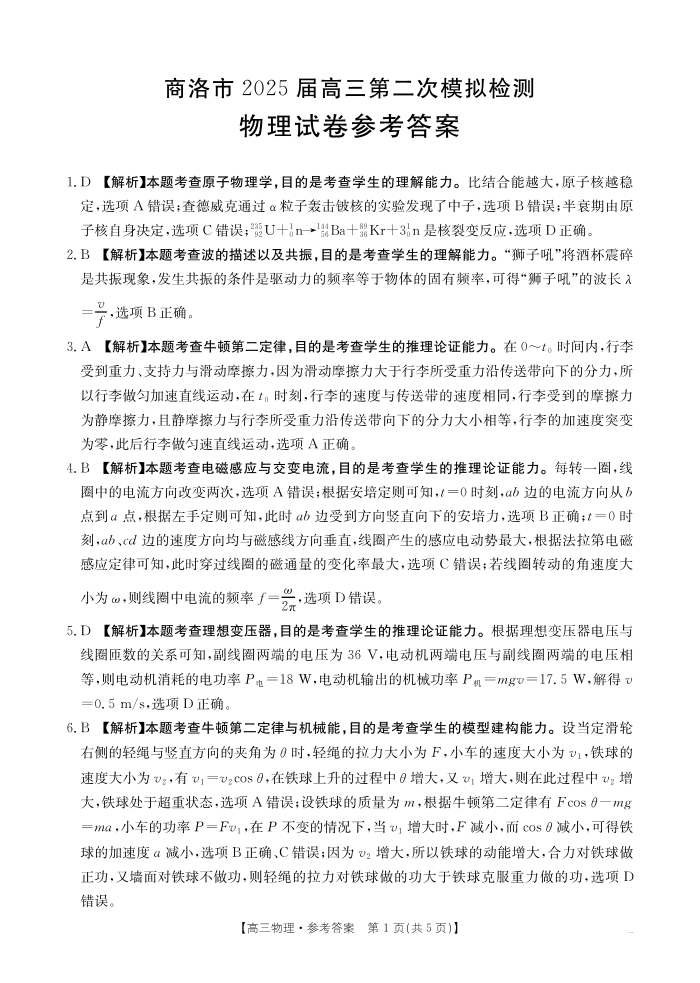 陕西省商洛市2025届高三第二次模拟考试 物理答案.pdf