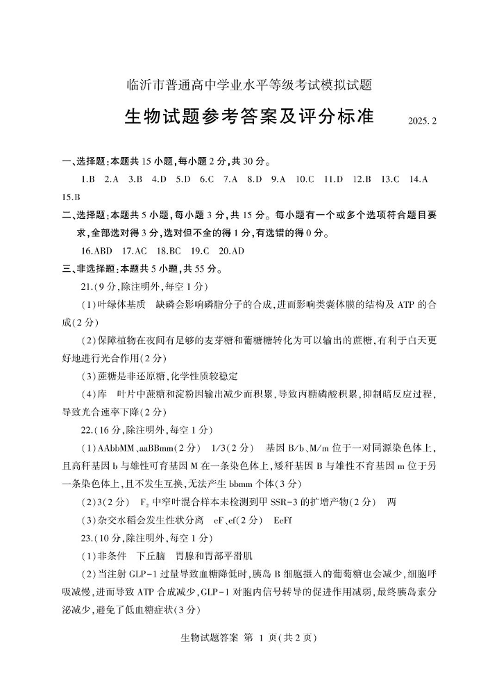 山东省临沂市2025年普通高等学校招生全国统一考试(模拟)生物答案.pdf