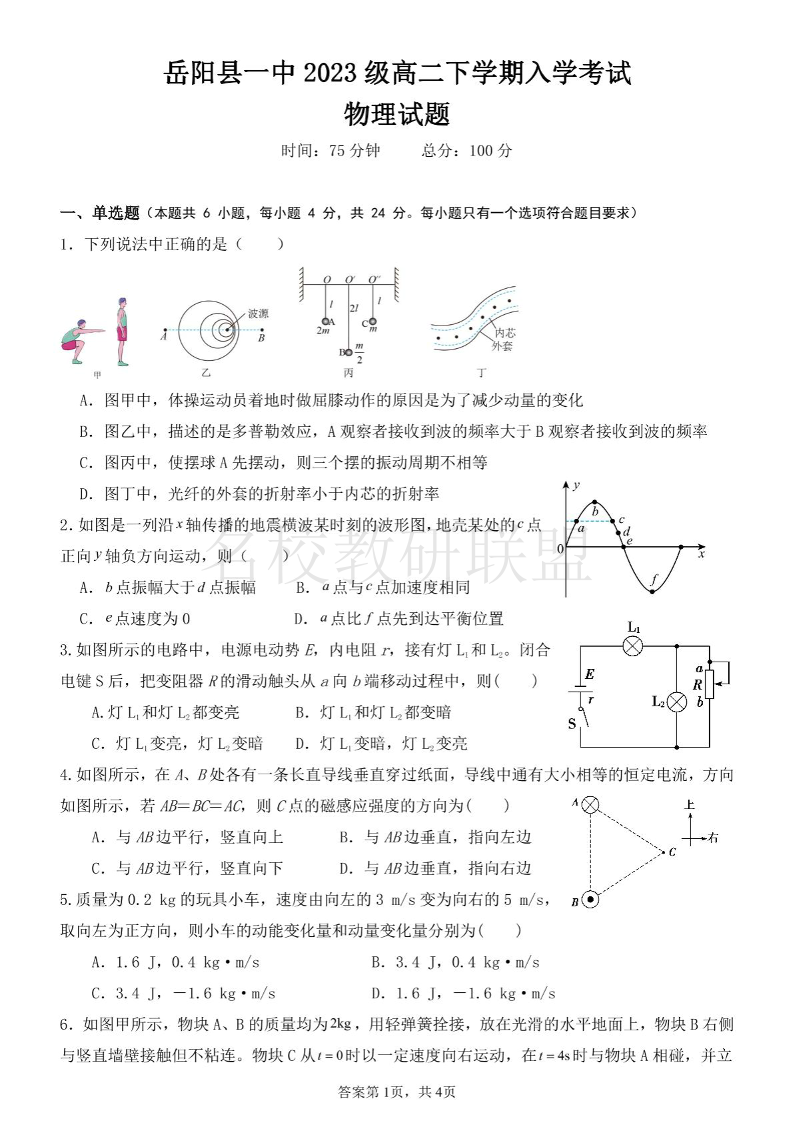 湖南省岳阳县第一中学2025年高二下学期开学考试 物理(含答案).pdf