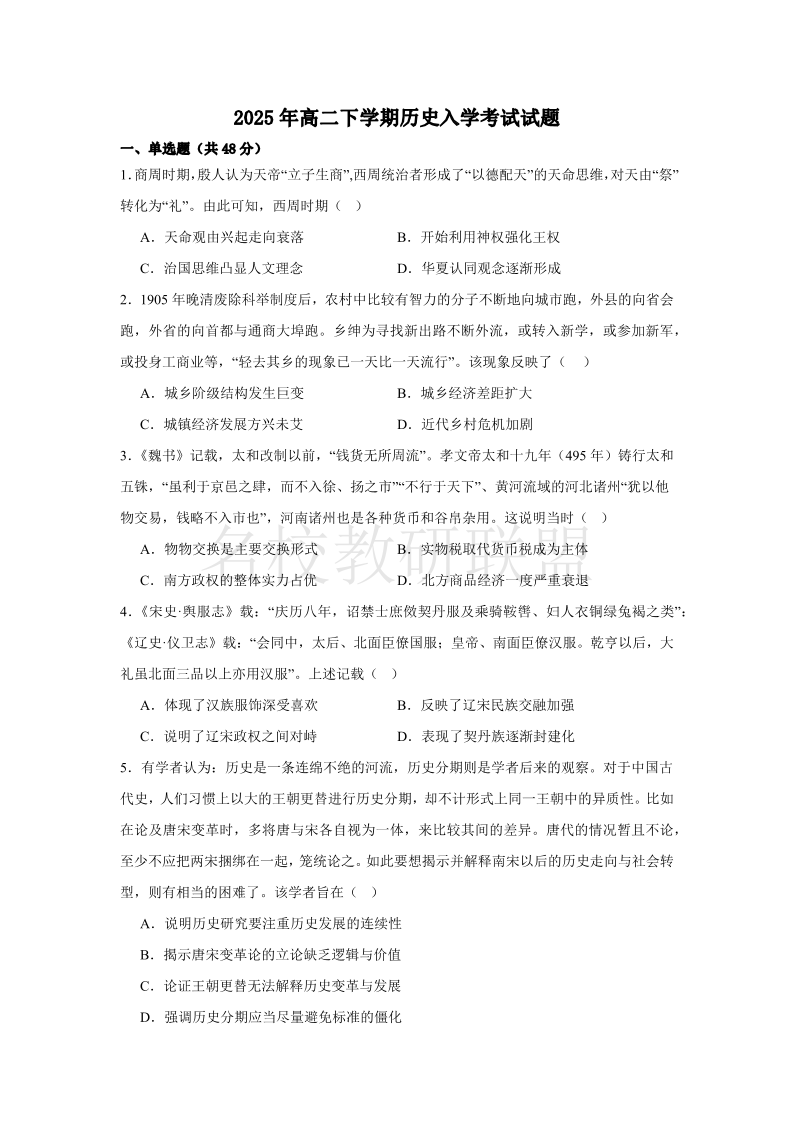 湖南省岳阳县第一中学2025年高二下学期开学考试 历史(含答案).pdf