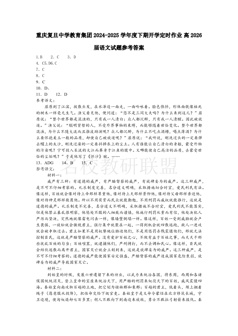 重庆复旦中学教育集团2024-2025学年高二下学期开学定时作业 语文答案.pdf