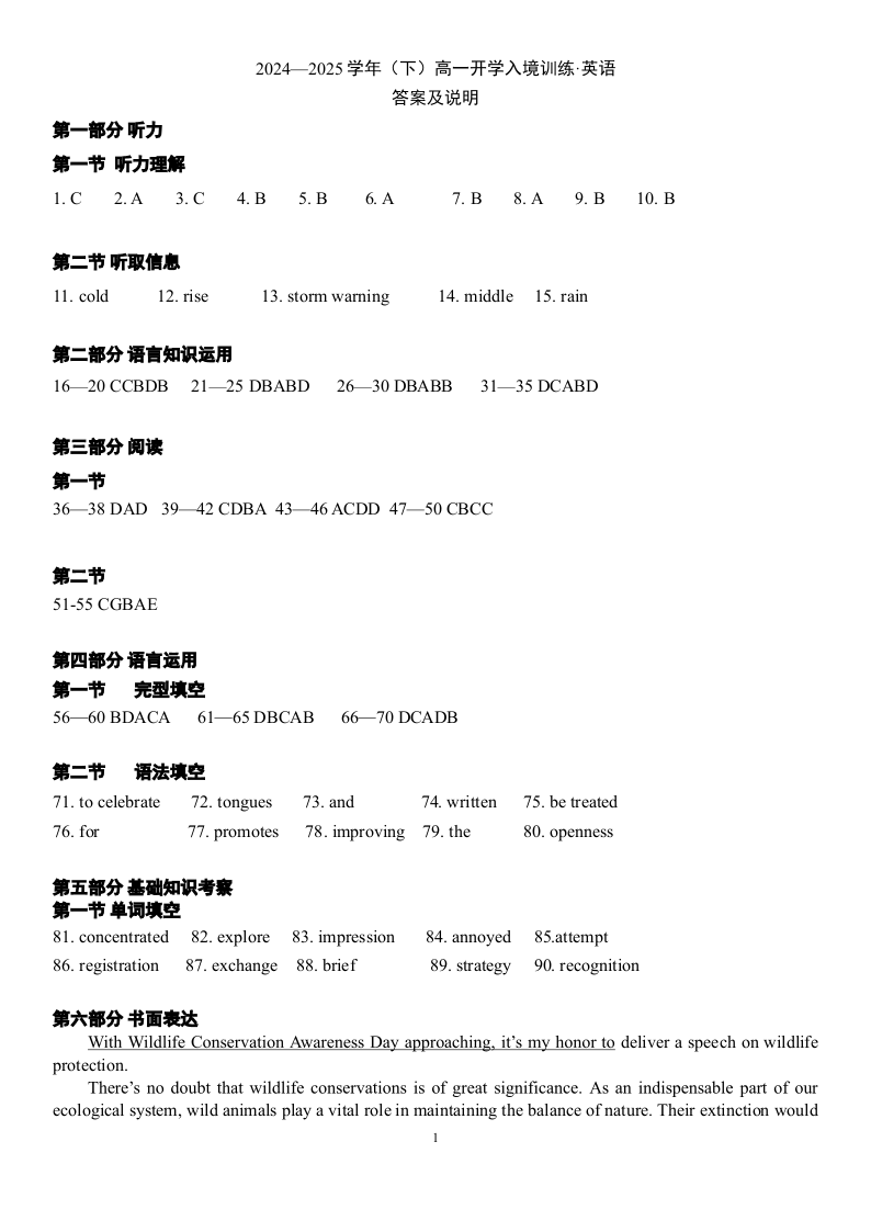 广东实验中学2024-2025学年高一下学期开学考试 英语答案.pdf