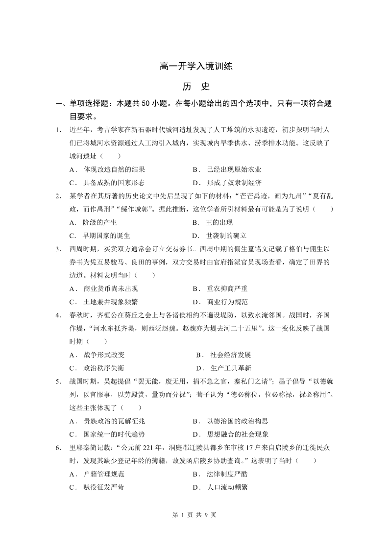 广东实验中学2024-2025学年高一下学期开学考试 历史.pdf