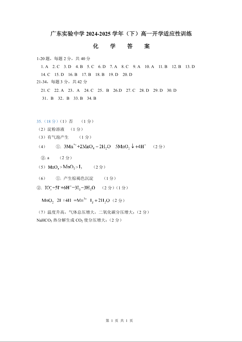 广东实验中学2024-2025学年高一下学期开学考试 化学答案.docx