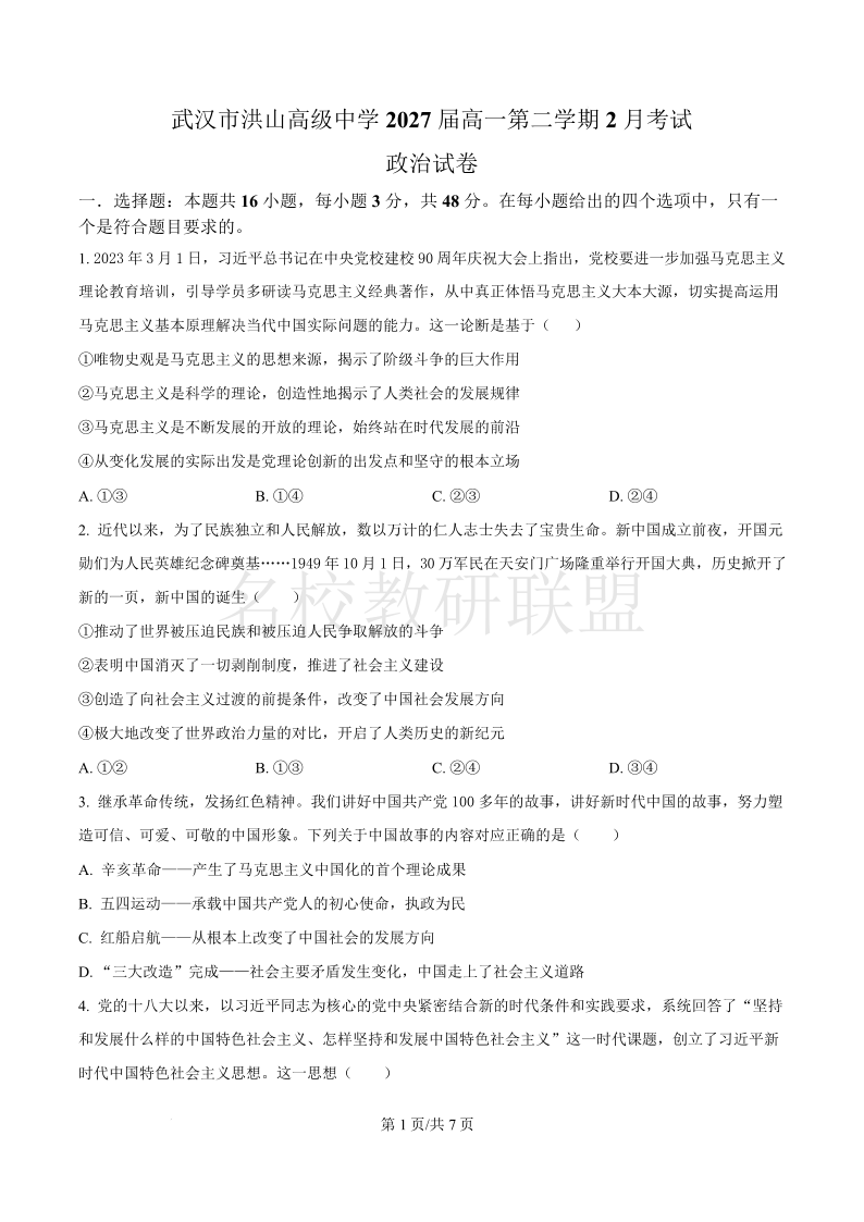 湖北省武汉市洪山高级中学2024-2025学年高一下学期2月考试 政治.pdf