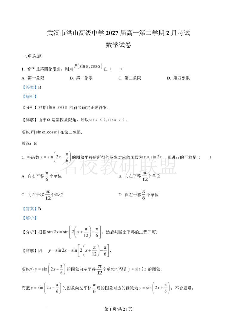 湖北省武汉市洪山高级中学2024-2025学年高一下学期2月考试 数学答案.pdf