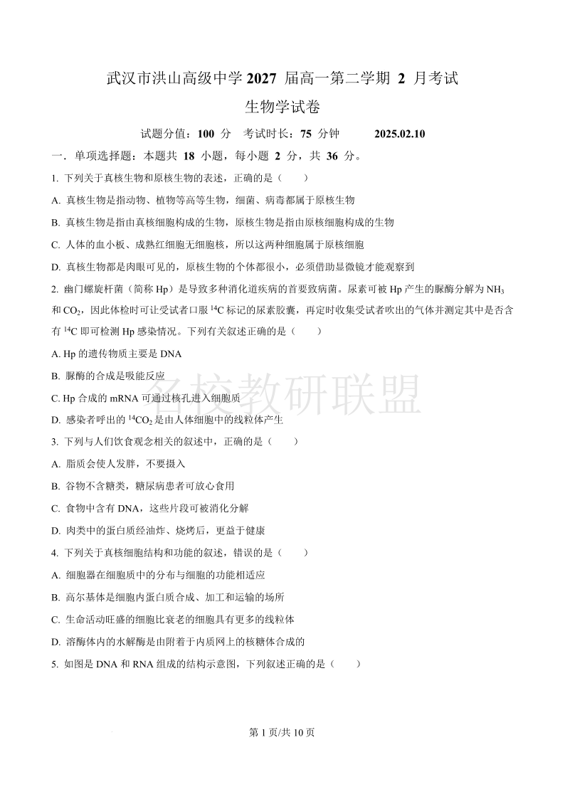 湖北省武汉市洪山高级中学2024-2025学年高一下学期2月考试 生物.pdf
