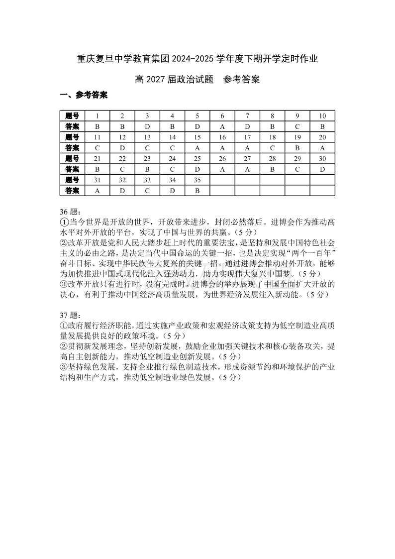 重庆复旦中学2024-2025学年高一下学期开学定时作业 政治答案.pdf