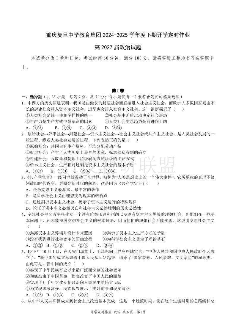 重庆复旦中学2024-2025学年高一下学期开学定时作业 政治.pdf