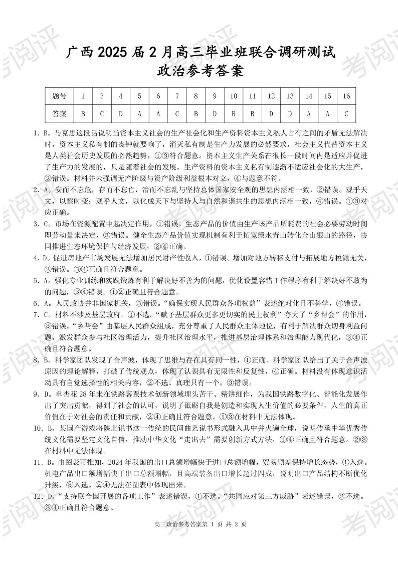 广西2025届2月高三毕业班联合调研测试 政治答案.pdf