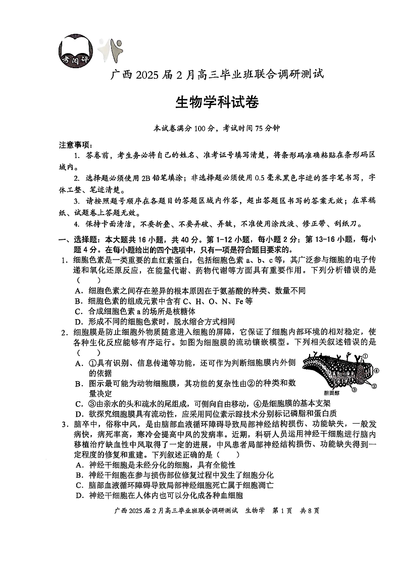 广西2025届2月高三毕业班联合调研测试 生物.pdf