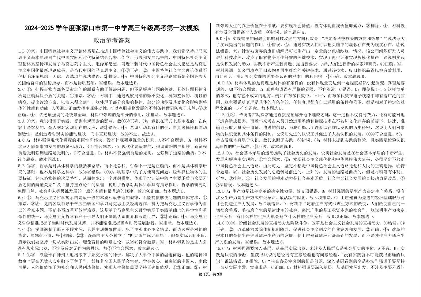 张家口市第一中学2025届高三年级高考第一次模拟 政治答案.docx