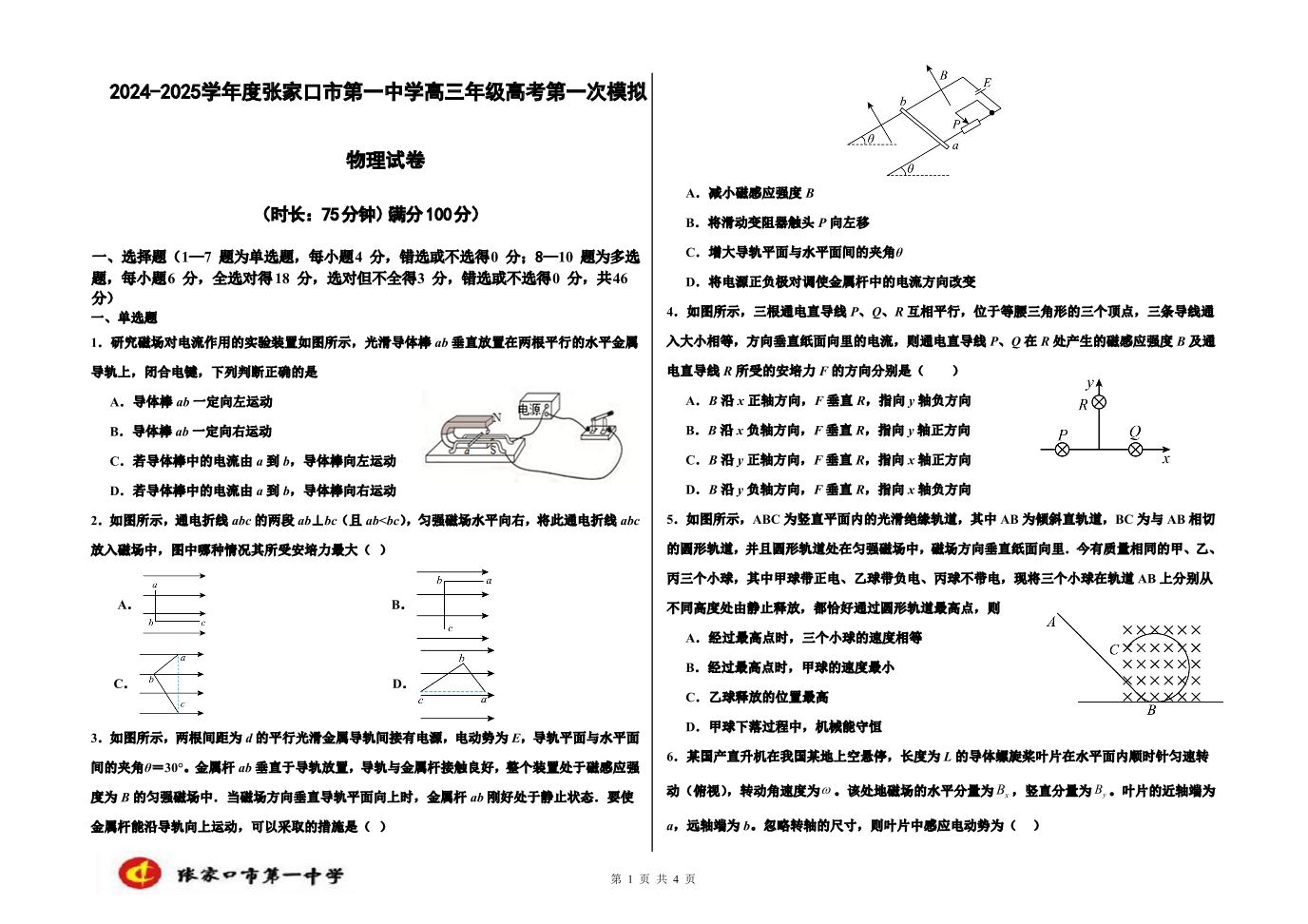 张家口市第一中学2025届高三年级高考第一次模拟 物理.pdf