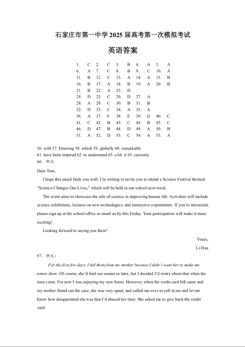 石家庄市第一中学2025届高考第一次模拟考试 英语答案.docx