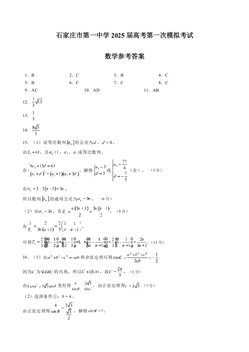 石家庄市第一中学2025届高考第一次模拟考试 数学答案.docx