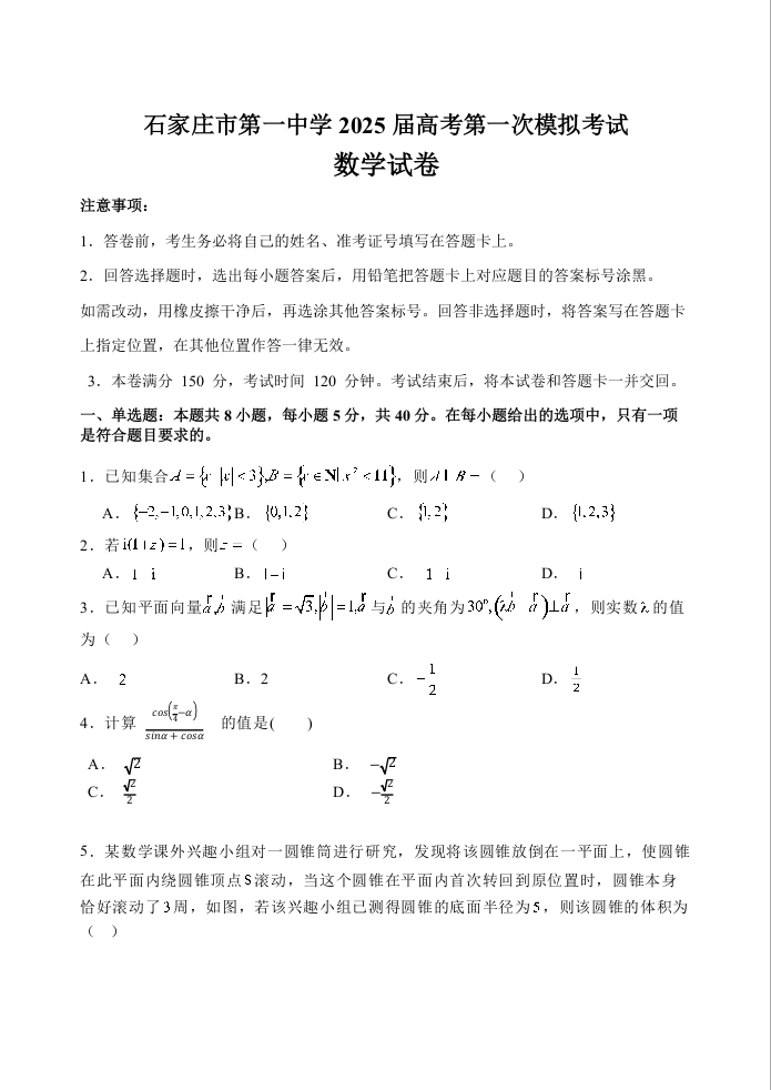 石家庄市第一中学2025届高考第一次模拟考试 数学.docx