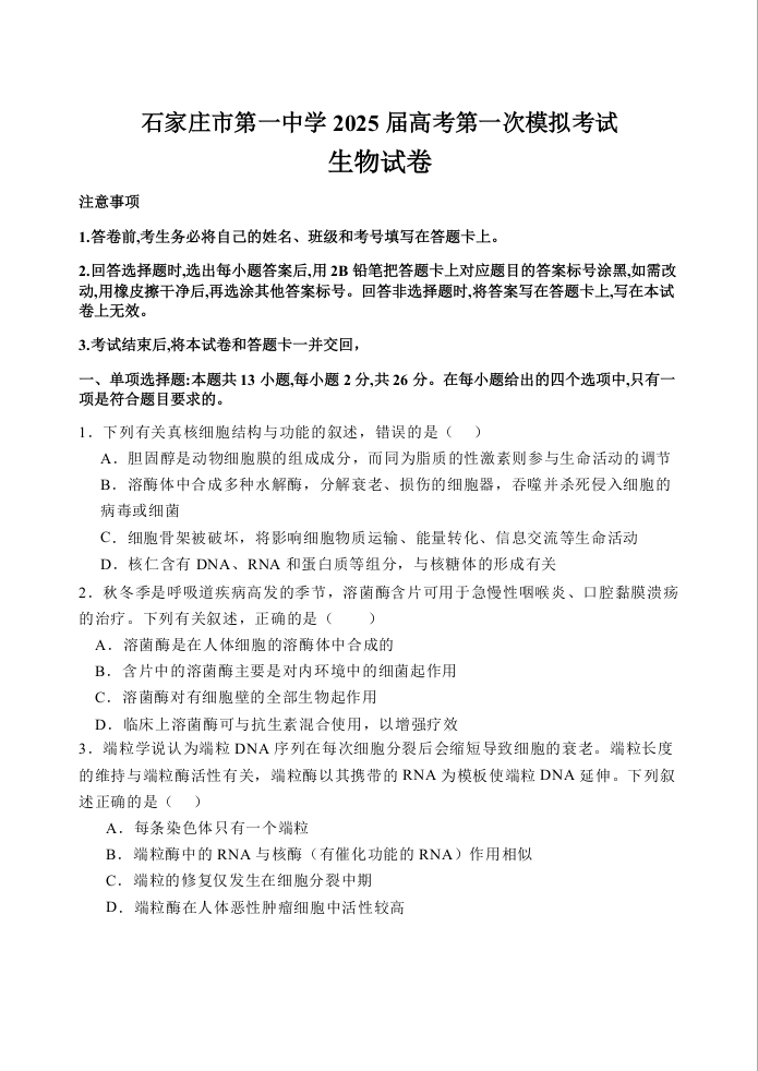 石家庄市第一中学2025届高考第一次模拟考试 生物.docx