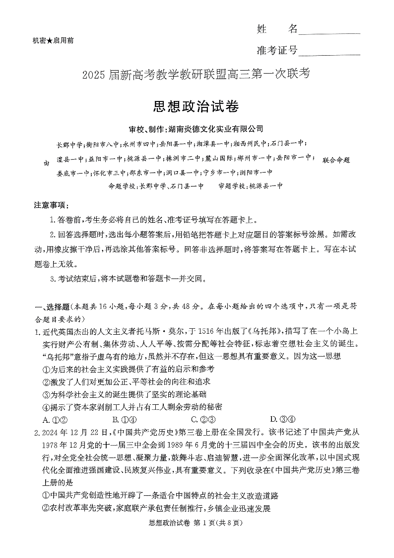 湖南省2025届新高考教学教研联盟高三第一次联考 政治.pdf