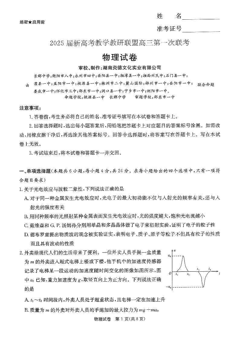 湖南省2025届新高考教学教研联盟高三第一次联考 物理.pdf