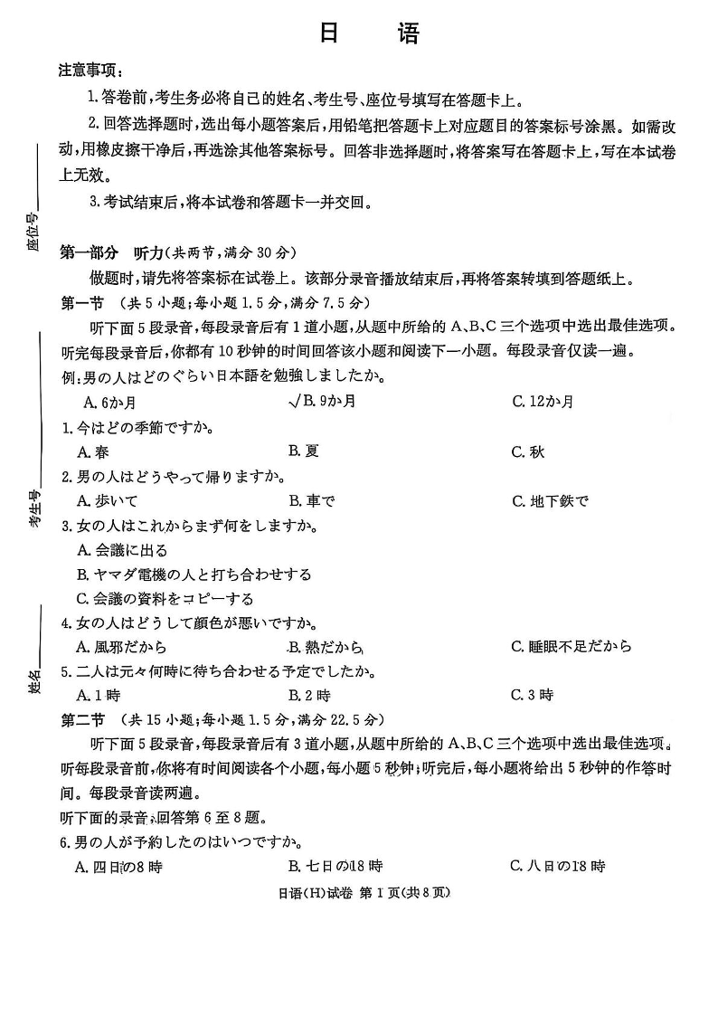 湖南省2025届新高考教学教研联盟高三第一次联考 日语.pdf