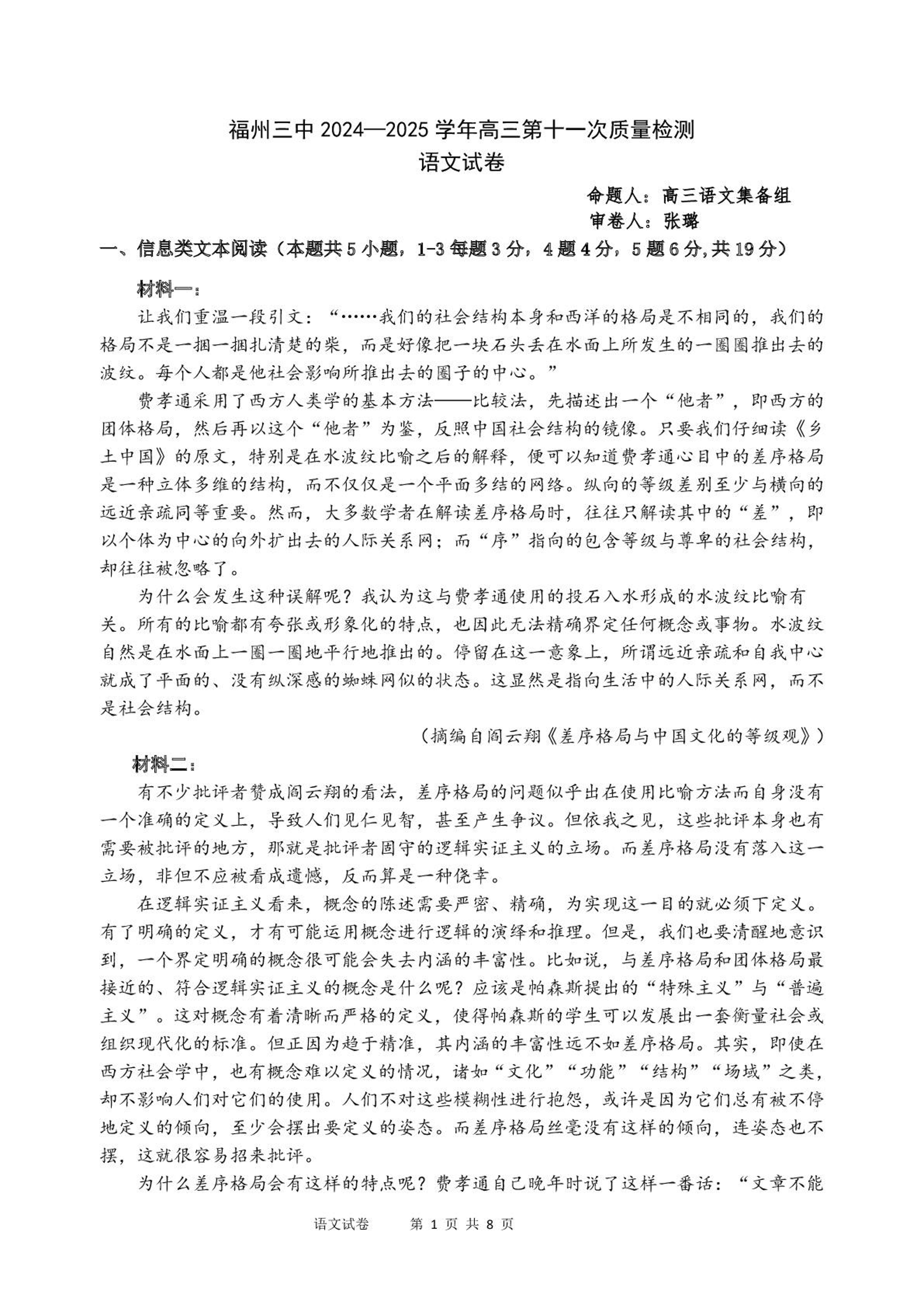 福州三中2024-2025学年第二学期高三第十一次质量检测 语文(含答案).pdf