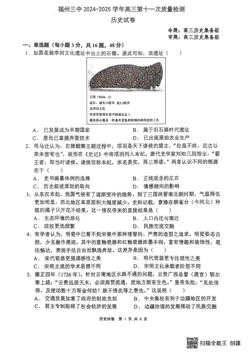 福州三中2024-2025学年第二学期高三第十一次质量检测 历史(含答案).pdf