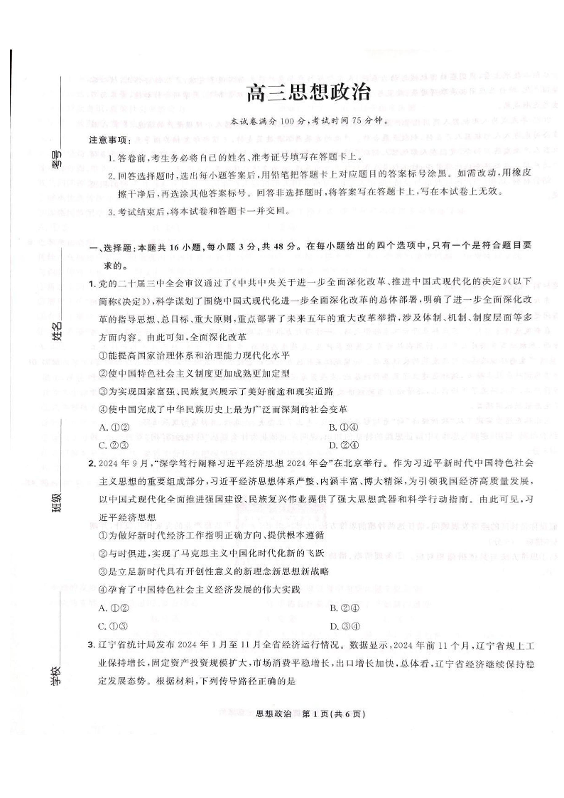 东北三省精准教学联盟2025届高三3月联考 政治(含答案).pdf