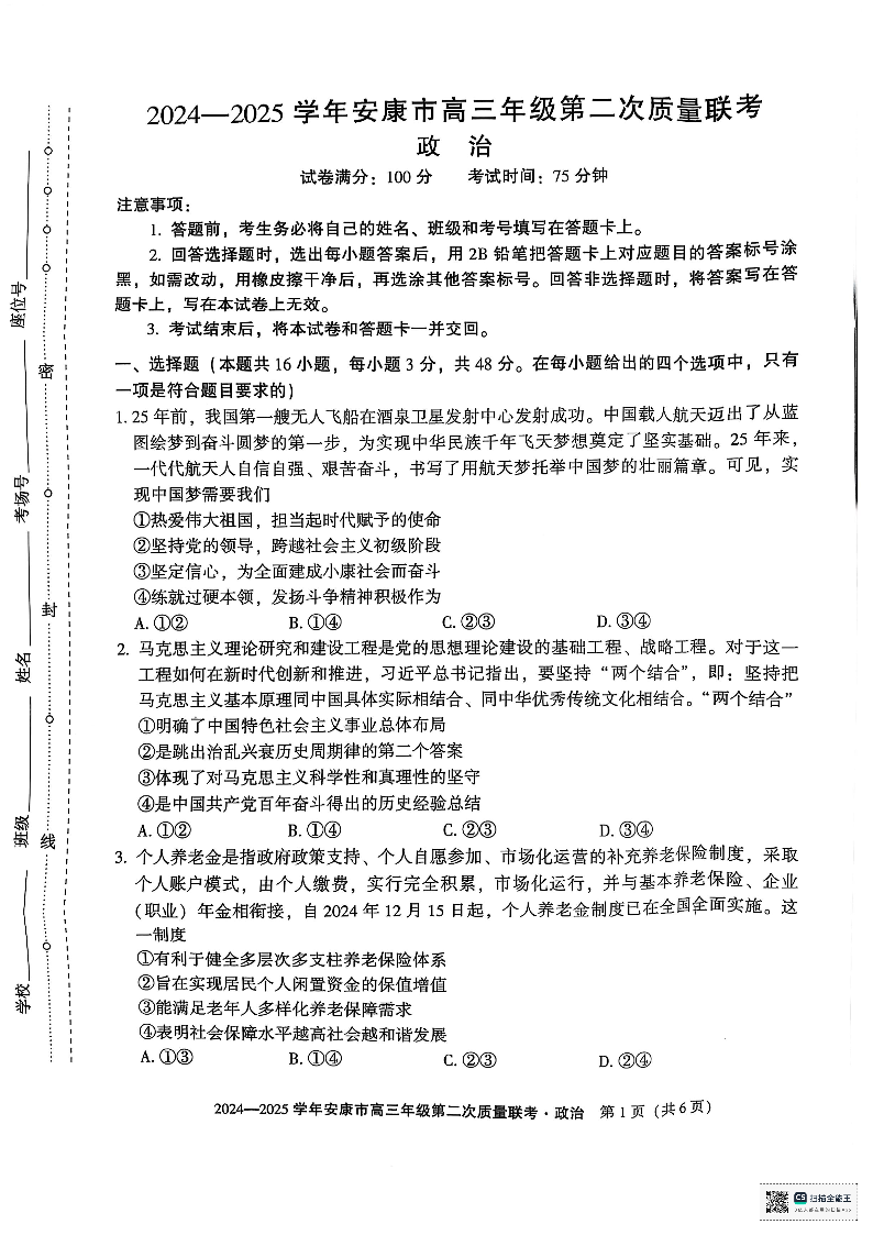 陕西省安康市2025届高三年级第二次质量联考 政治.pdf