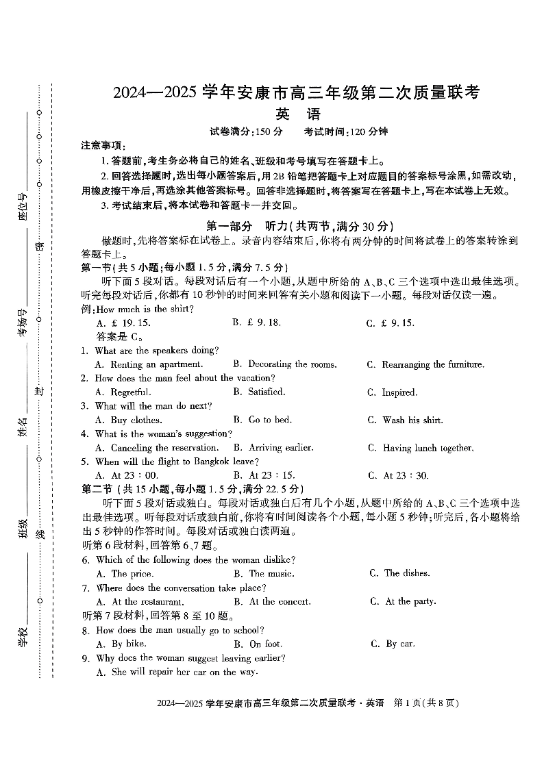陕西省安康市2025届高三年级第二次质量联考 英语.pdf