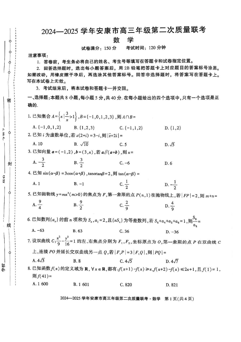 陕西省安康市2025届高三年级第二次质量联考 数学.pdf