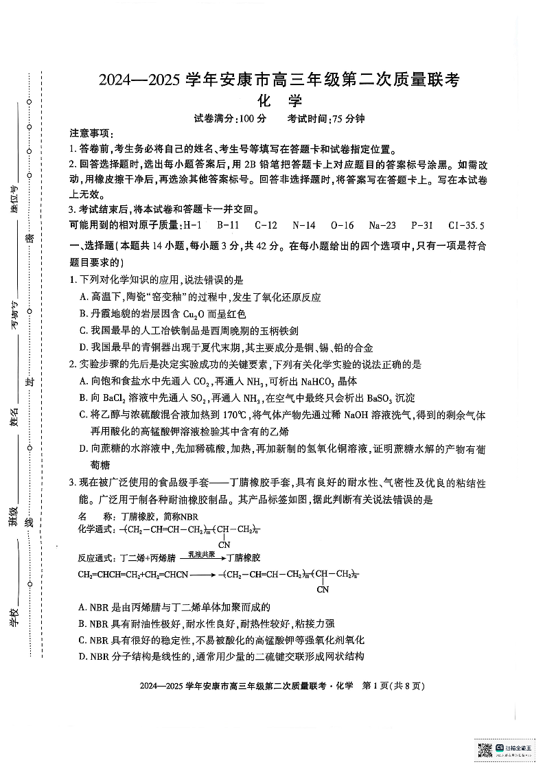 陕西省安康市2025届高三年级第二次质量联考 化学.pdf