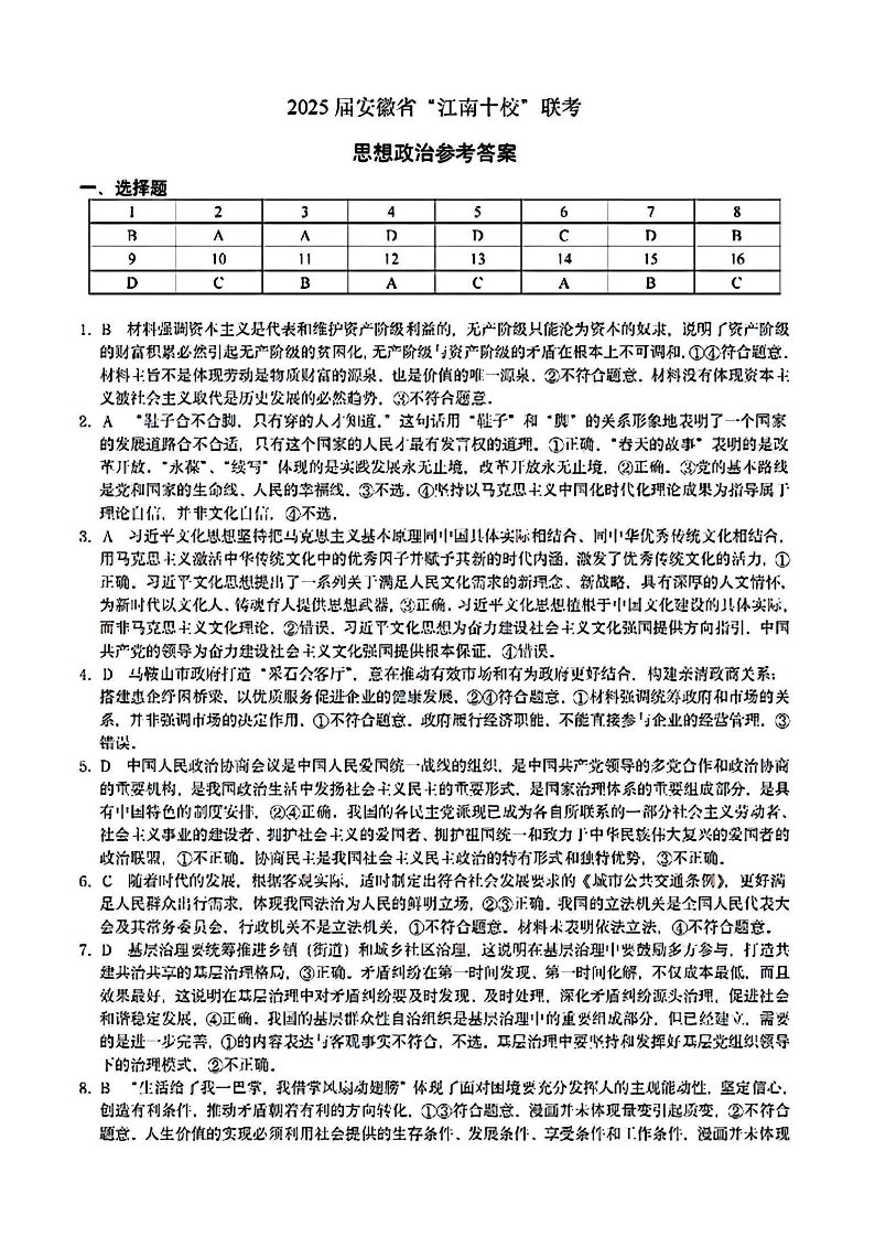 安徽省江南十校2025届高三3月联考 政治答案.pdf